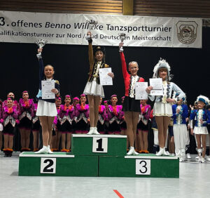 (JS)Am vergangenen Wochenende starteten einige unserer Solisten in Hamm. Den Anfang machte unser Jugendmariechen Tilda – sie ertanzte sich mit 391 Punkten einen guten Platz im Mittelfeld. Am Nachmittag ging es für Lynn (406 Punkte), Frieda (411 Punkte), Naemi (413 Punkte) & Luisa (426 Punkte) an den Start. Ein besonderes Highlight stand am Ende der Disziplin fest: Luisa ertanzte sich nicht nur Platz 4 sondern auf die Qualifikation für die Norddeutschen Meisterschaften in Düren!