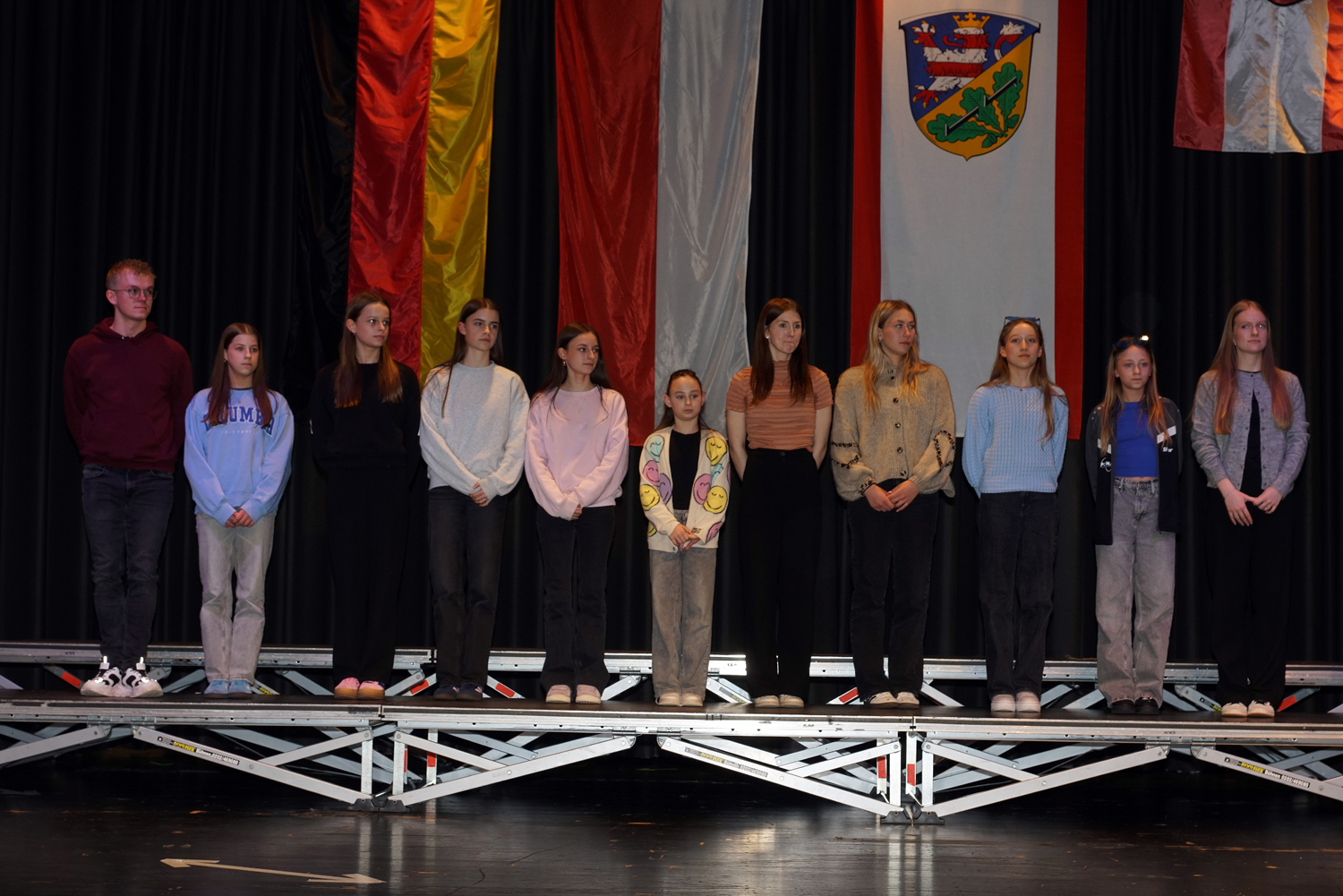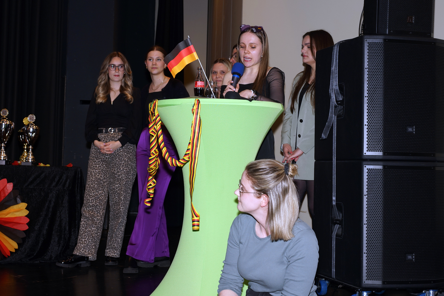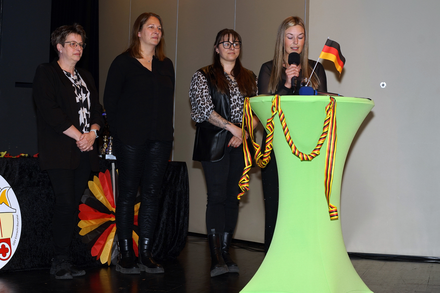 Die Stadtgarde mit Team betrat als nächstes die Bühne. Alena Seifert spiegelte auch die vergangene Saison und erzählte von der uneingeschränkten Leistungsbereitschaft der Garde. Auch davon, welche Hochs und Tiefs sie durchlebten und das trotz der tollen Saisonleistungen im Marsch- und Schautanz diese am Ende nicht belohnt wurden. Ebenfalls wurde sich, wie bereits bei der Rittergarde, für die Unterstützung seitens des Vereins auf allen Ebenen bedankt.