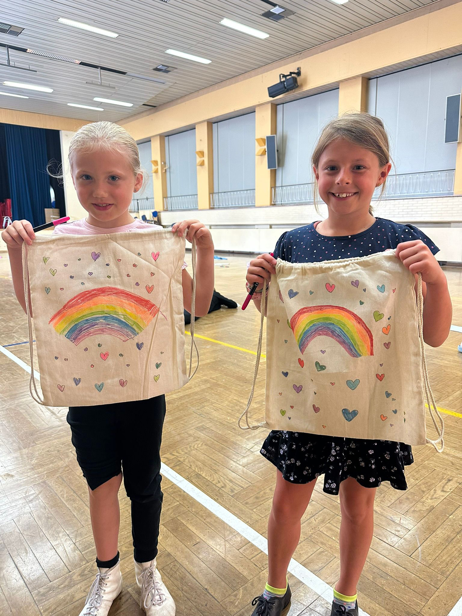 Jeder Tag war unter ein anderes Motto gestellt. Es wurden Turnbeutel bemalt, Regenbogenwindspiele gebastelt und unter anderem eine Miniolympiade durchgeführt. Weiterhin wurde mit den Kindern an den verschiedenen Tagen Hip-Hop und Zumba getanzt. Ein Tag wurde auch dem Gardetanz gewidmet. Die Kinder waren alle begeistert und mit viel Spaß bei der Sache. Am Freitag führten die Kinder dann das in der vergangenen Woche Erlernte den Eltern vor.