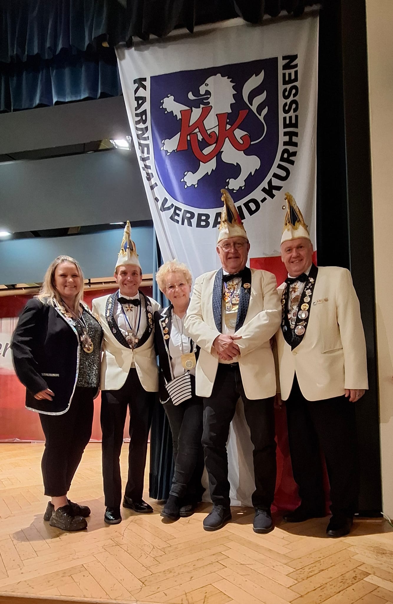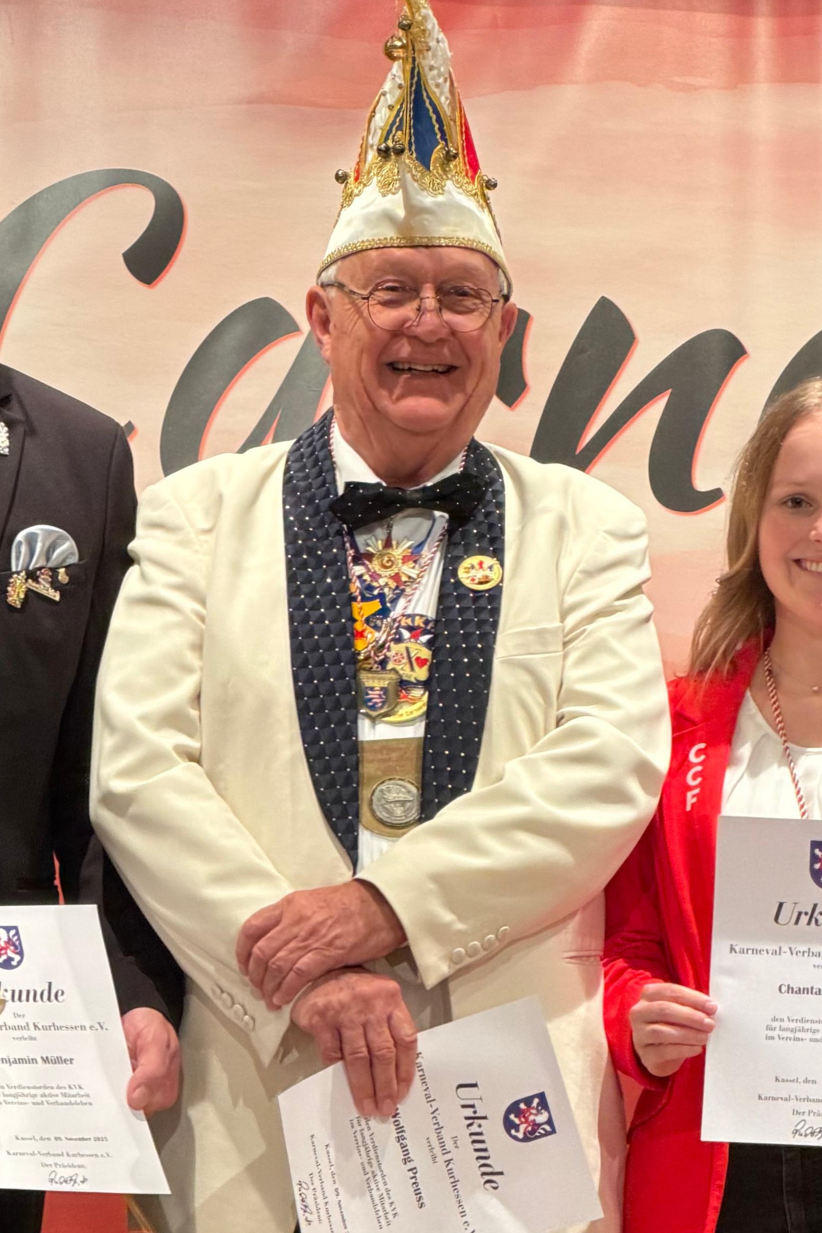 Grund genug, ihn mit dem Verdienstorden des Karneval-Verband Kurhessen zu ehren. Die Laudatio hielt Vizepräsident Frank Altrogge. Der Orden wurde ihm im Beisein einer kleinen Abordnung, die ihn am 09.11.2025 zum KVK-Ordensfest nach Fulda-Harmerz begleitet hat, verliehen.