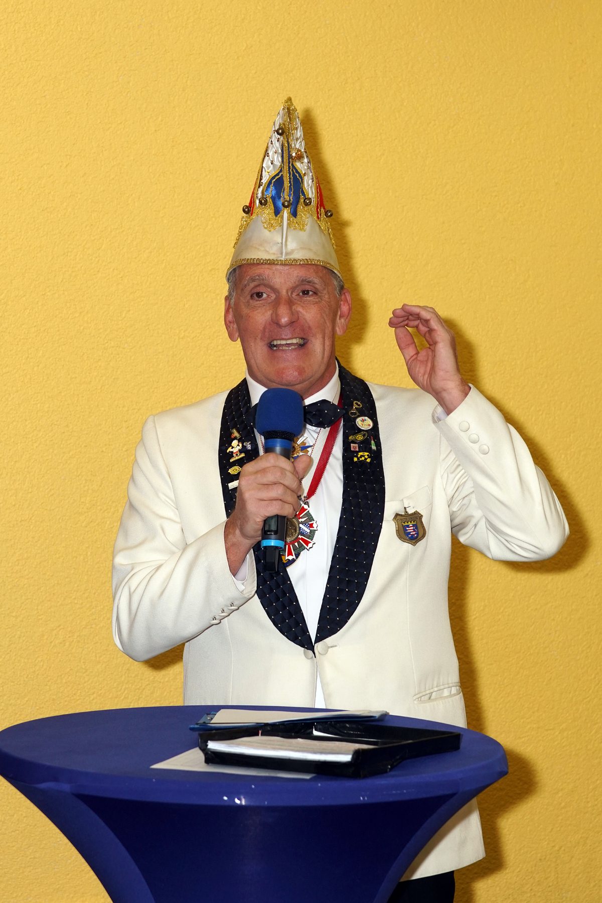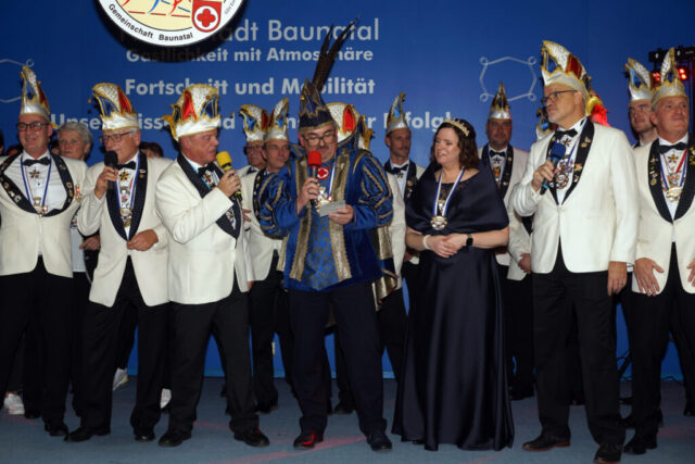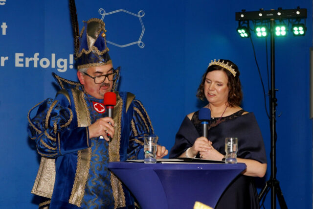 Zum Rahmenprogramm des Abends gehörte natürlich auch die erste offizielle Amtshandlung des neuen Prinzenpaares. Nach dem traditionellen Defilee der Gratulanten überreichten sie den Elferratsmännern- und frauen den neuen Sessionsorden der GCG.