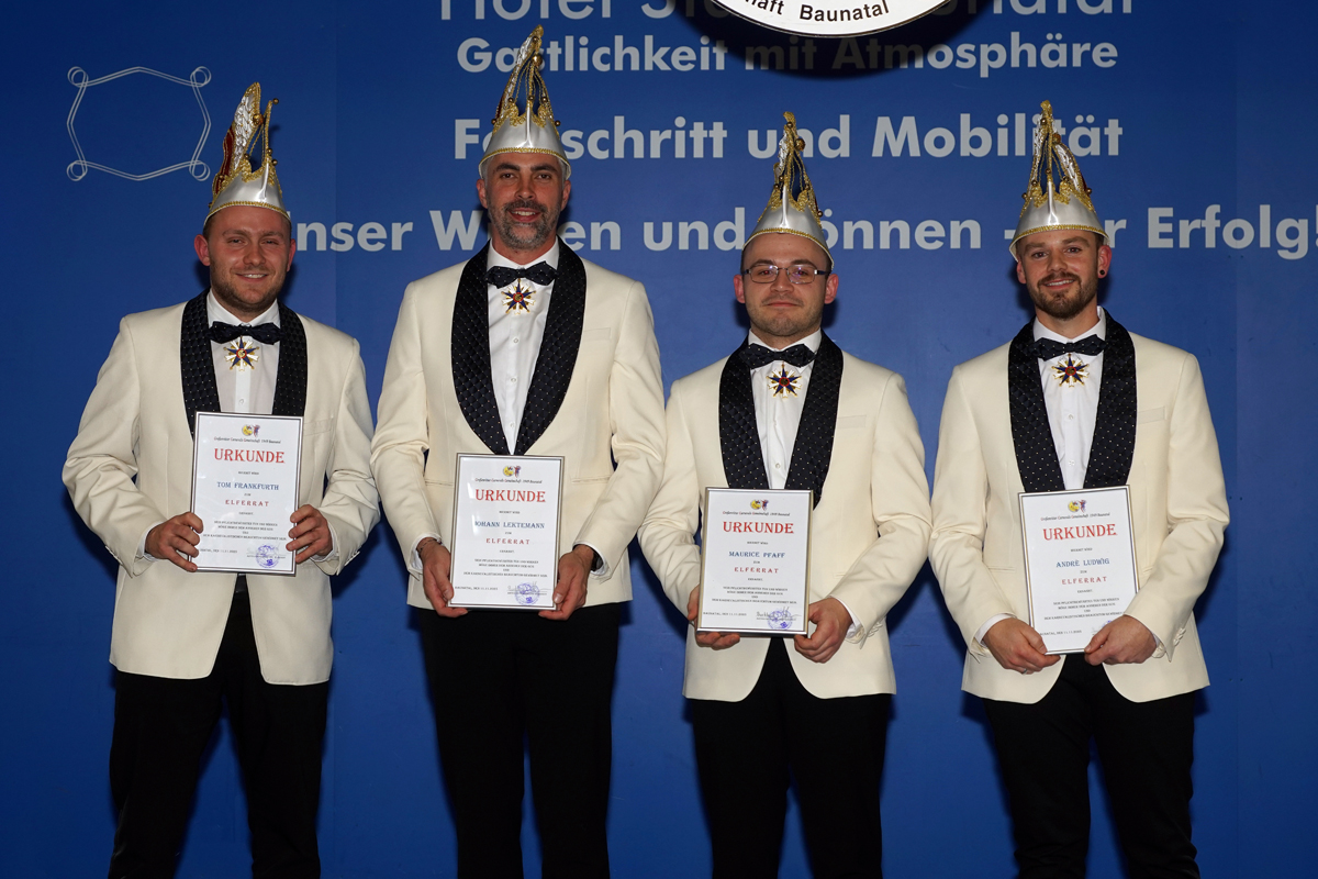 Der Elferrat der GCG wurde an diesem Abend um 4 neue Mitglieder erweitert. Tom Frankfurth, Johann Letkemann, Andre Ludwig und Maurice Pfaff wurden in den erlauchten Kreis aufgenommen. Interessante Dinge wurde vom stellvertretenden Elferratsbetreuer Stefan Walther über die Herren preisgegeben. Tom ist passionierter Staplerfahrer und der eingeschlagene Weg zum Elferrat wurde ihm förmlich in die Wiege gelegt. Johann hat kein Pferd auf dem Flur aber eins im Stall. Andre begeistert sich für Stockbrot und Maurice frönt dem Kegelsport.