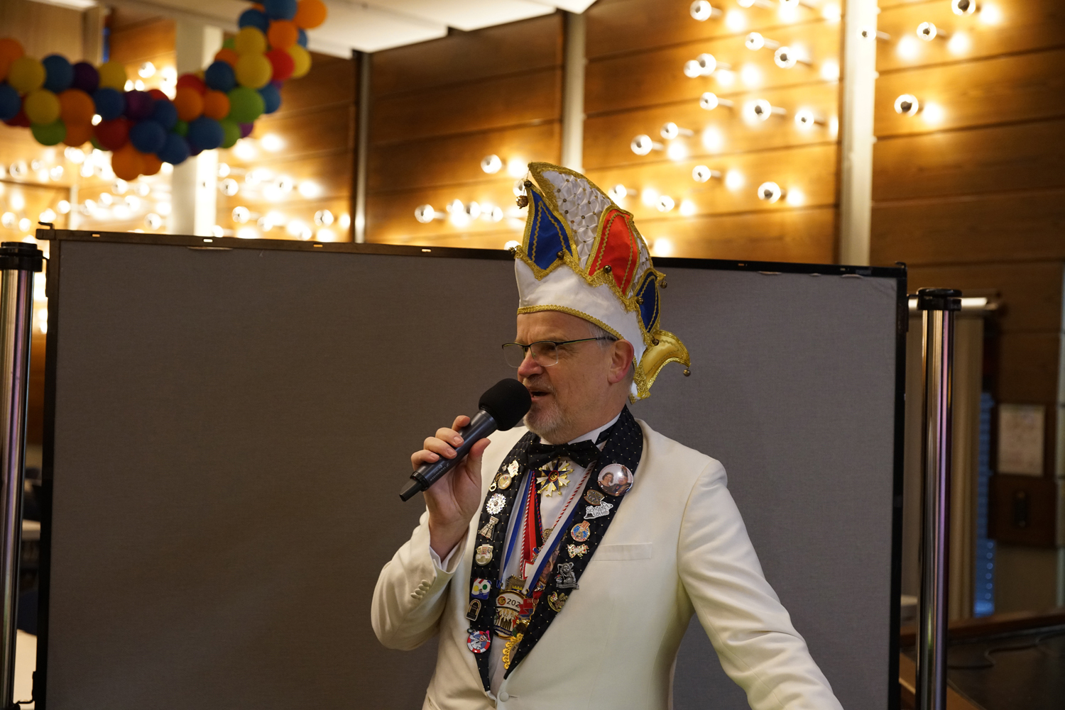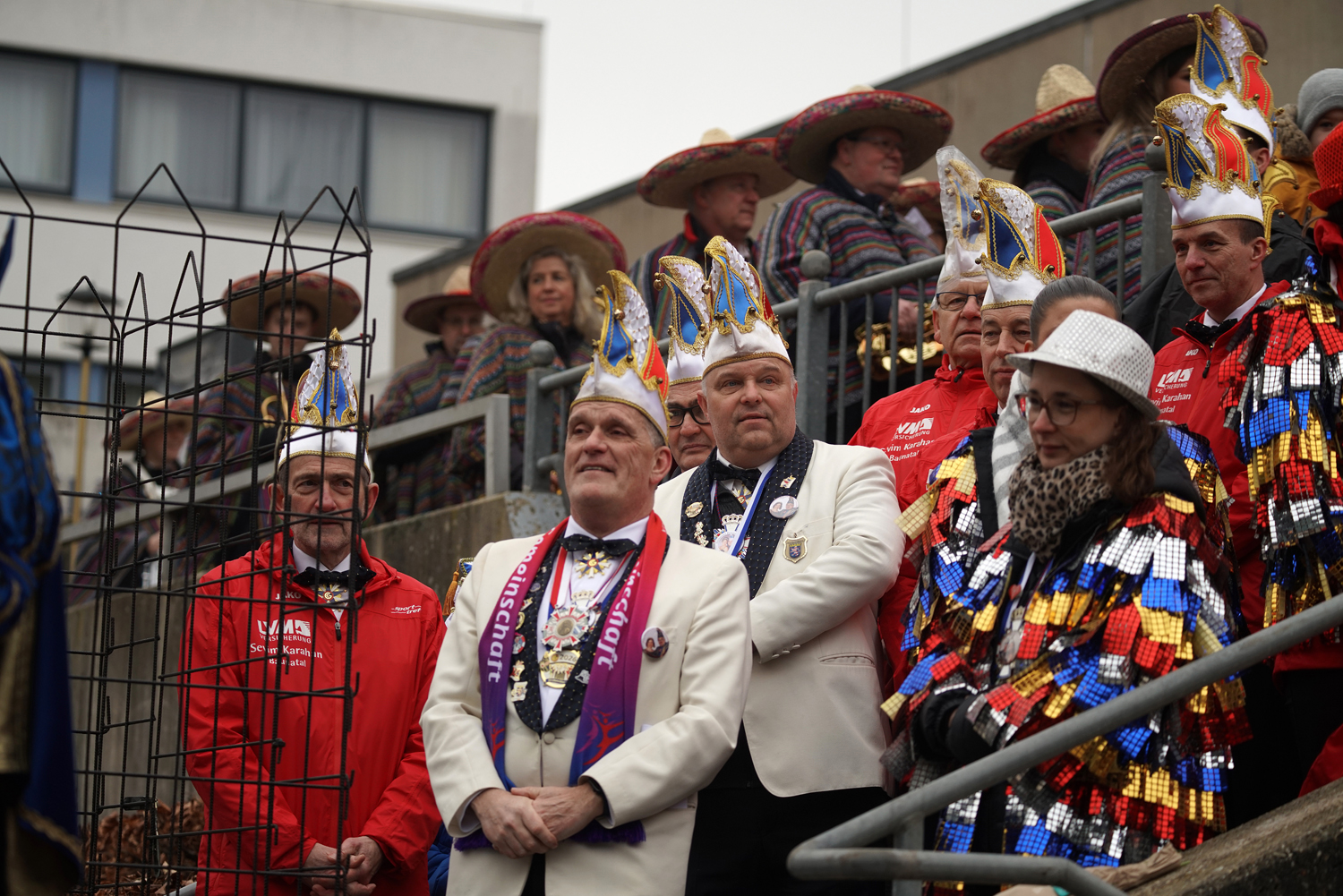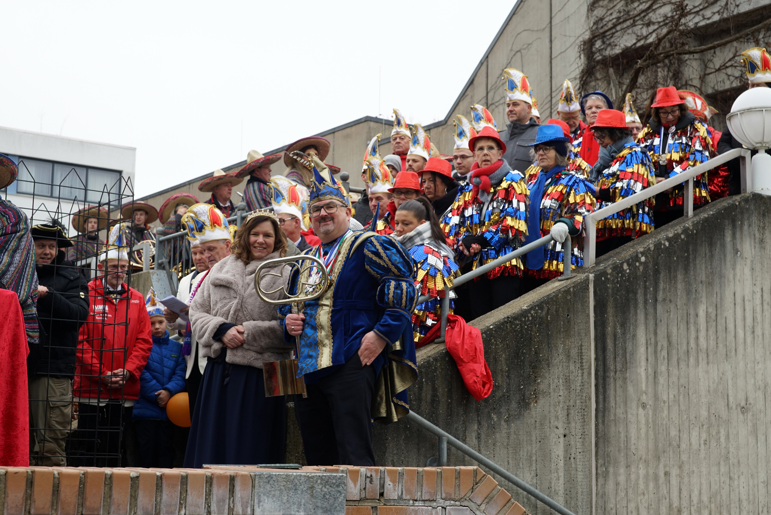 Präsident Burkhard Horn eröffnete den Reigen der Reden. Unter anderem kündigte er an, dass die Steuern nunmehr durch Kamelle ersetzt werden. Unser Prinzenpaar Christian I. und Manuela I. versicherte dem Bürgermeister, dass die Stadtkasse nicht angerührt wird. Bürgermeister Henry Richter erwiderte mit einem lustigen Vortrag, was aber nicht davor schützte, dass die Verantwortlichen der Stadt in den Käfig gesperrt wurden. Reiner Heine hat dann versucht, die Narren etwas milde zu stimmen. Man ist ja Mensch und hat sich dann versöhnt und die Stadthalle geentert, wo im vollbesetzten Saal die GCG noch ein kleines Programm präsentierte.