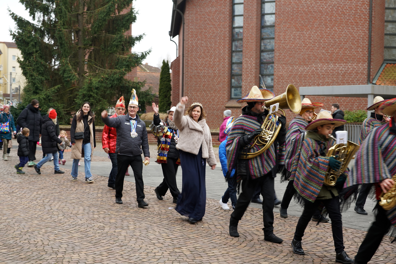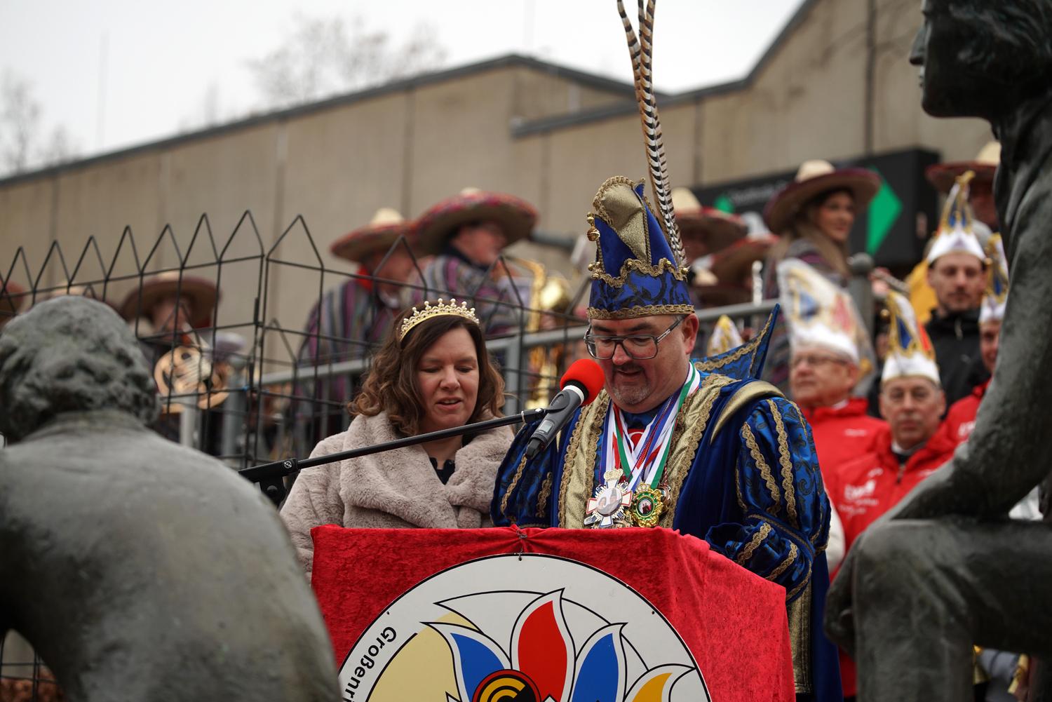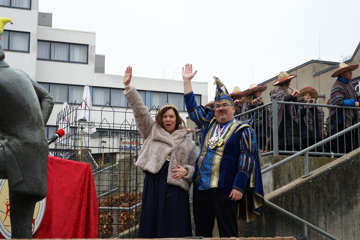 Präsident Burkhard Horn eröffnete den Reigen der Reden. Unter anderem kündigte er an, dass die Steuern nunmehr durch Kamelle ersetzt werden. Unser Prinzenpaar Christian I. und Manuela I. versicherte dem Bürgermeister, dass die Stadtkasse nicht angerührt wird. Bürgermeister Henry Richter erwiderte mit einem lustigen Vortrag, was aber nicht davor schützte, dass die Verantwortlichen der Stadt in den Käfig gesperrt wurden. Reiner Heine hat dann versucht, die Narren etwas milde zu stimmen. Man ist ja Mensch und hat sich dann versöhnt und die Stadthalle geentert, wo im vollbesetzten Saal die GCG noch ein kleines Programm präsentierte.