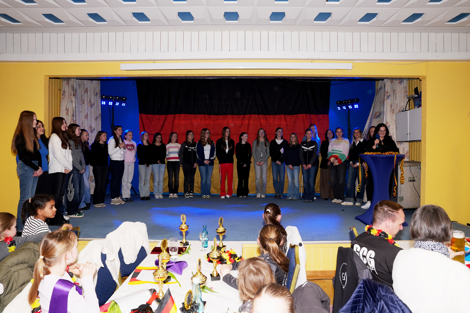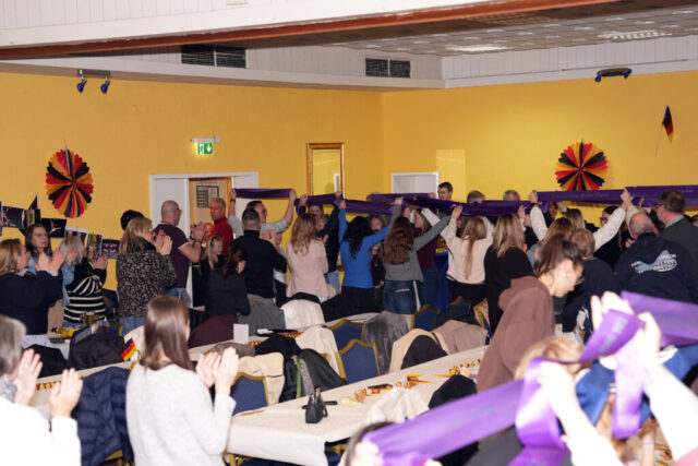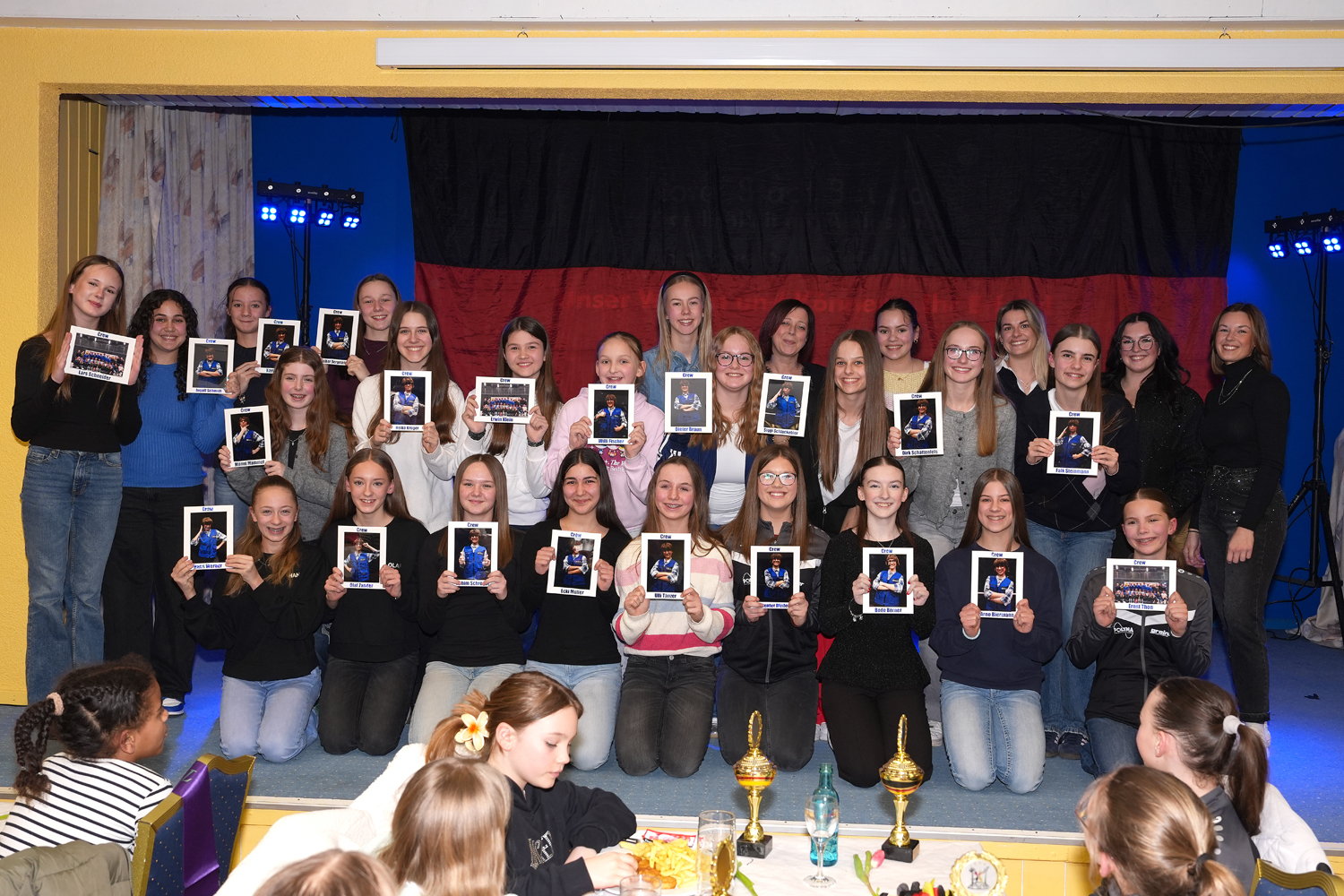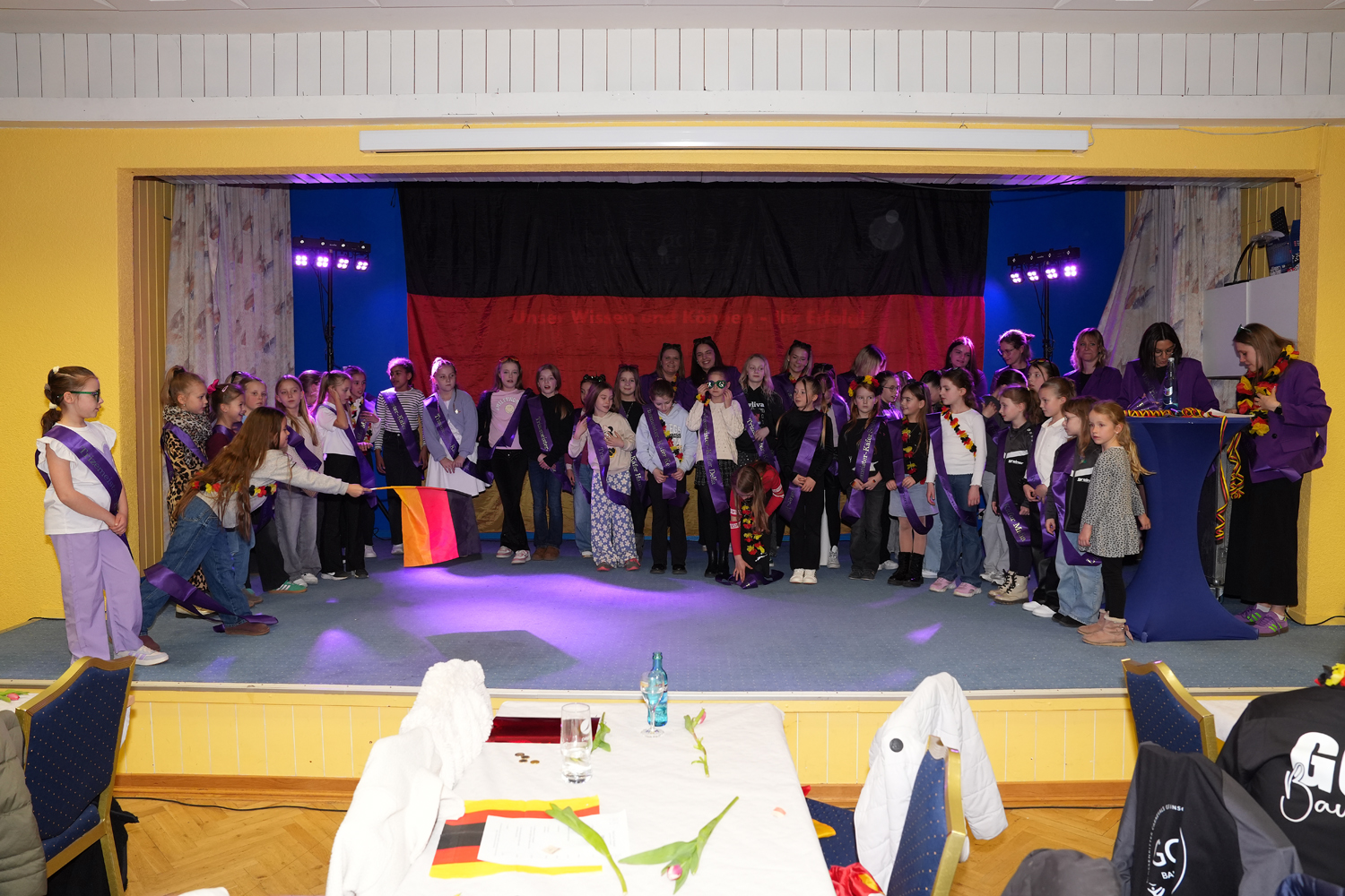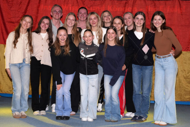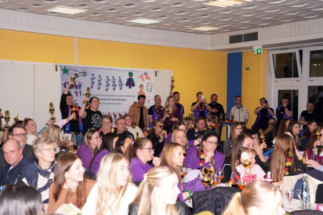 Dann betrat die Rittergarde als erstes mit ihrer Trainerriege und den Betreuerrinnen die Bühne. Als Überraschung gab es von den beiden anderen Garden für jede Tänzerin eine Schärpe. Diese Schärpe war mit den errungenen Titeln und den jeweiligen Namen bedruckt. In ihrer Rede ließ Steffi Wolke noch einmal die vergangene Saison Revue passieren und bedankte sich bei allen, die an den erreichten Erfolgen beteiligt waren. Ein besonderer Dank ging hierbei für ihre unermüdliche Arbeit an das Requisitenteam und an das Nähteam.