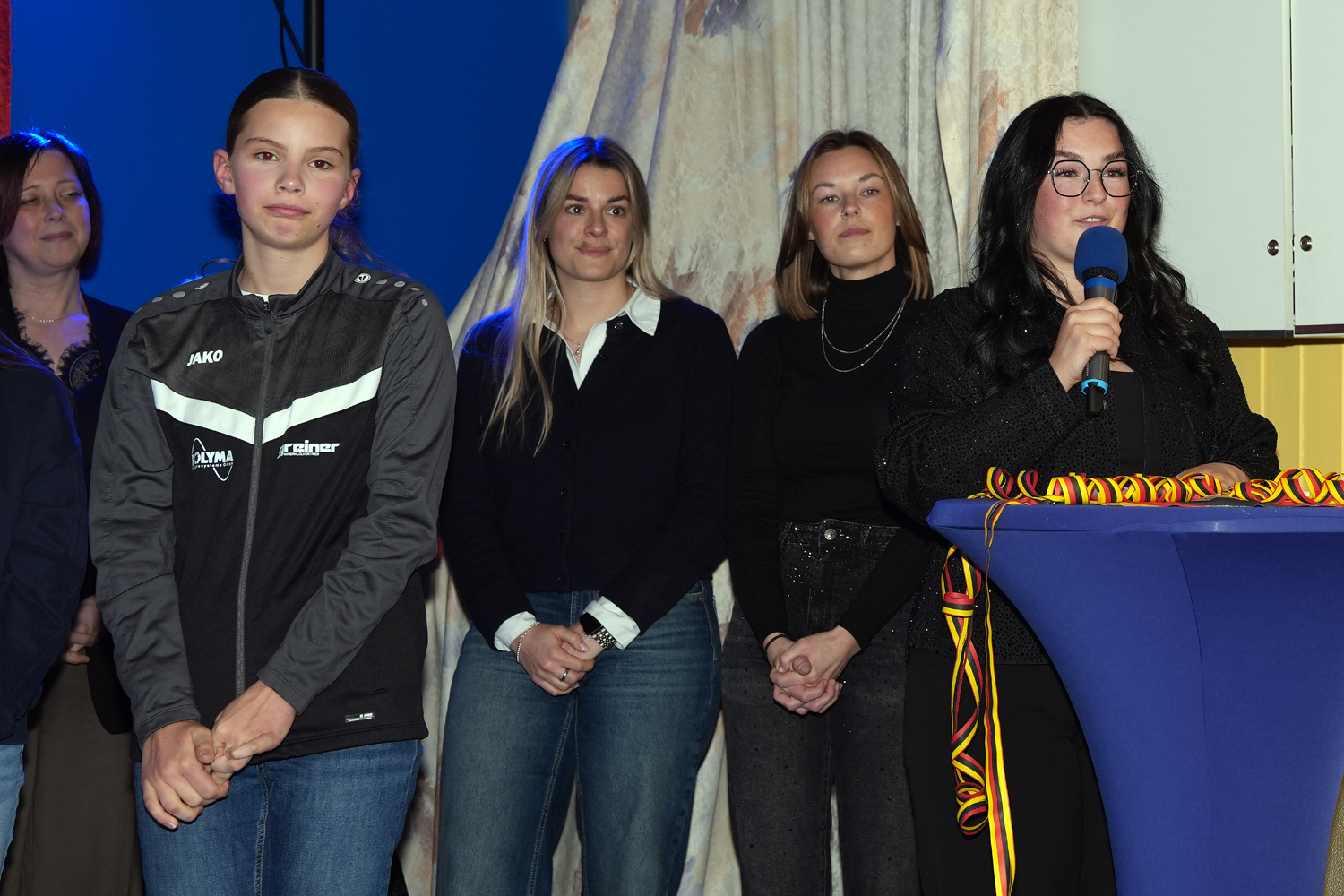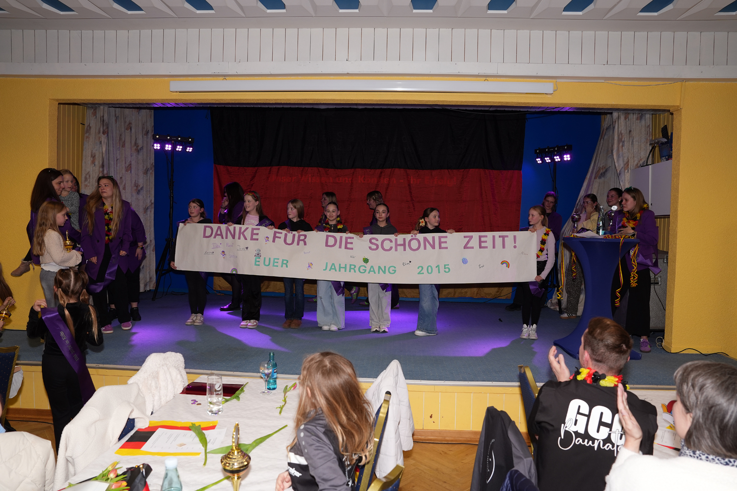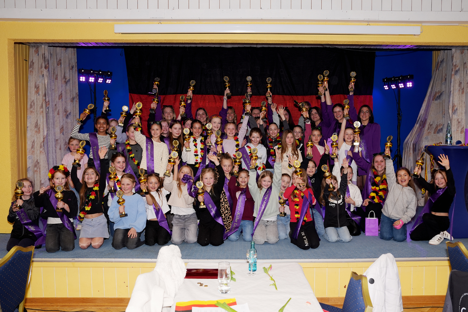 Dann betrat die Rittergarde als erstes mit ihrer Trainerriege und den Betreuerrinnen die Bühne. Als Überraschung gab es von den beiden anderen Garden für jede Tänzerin eine Schärpe. Diese Schärpe war mit den errungenen Titeln und den jeweiligen Namen bedruckt. In ihrer Rede ließ Steffi Wolke noch einmal die vergangene Saison Revue passieren und bedankte sich bei allen, die an den erreichten Erfolgen beteiligt waren. Ein besonderer Dank ging hierbei für ihre unermüdliche Arbeit an das Requisitenteam und an das Nähteam.